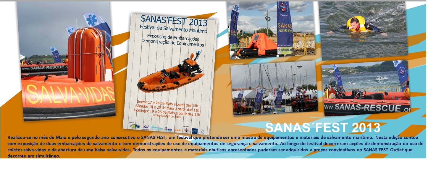 SANAS´FEST 2013Evento organizado pelo SANAS, que tem como objectivo a apresentação e divulgação dos materiais e equipamentos utilizados na segurança náutica e que podem ser adquiridos durante o evento no outlet que decorrerá em simultâneo. Dias 17 a 19 / 24 a 26 de Maio – Passeio Marítimo de Algés |