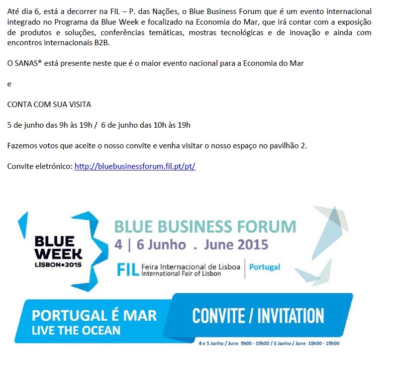 SANAS ESTEVE PRESENTE BLUE BUSINESS FORUM – O MAIOR EVENTO NACIONAL PARA A ECONOMIA DO MARFoi com muito gosto que o SANAS aceitou o convite da Fundação AIP e esteve presente neste evento internacional que contou com mais de duzentos expositores e com visitantes oriundos de mais de setenta países. Integrado no Programa da Blue Week e focalizado na Economia do Mar, o evento foi uma mostra de exposições de produtos e soluções, de conferências temáticas, de tecnologia e inovação, assim como de encontros internacionais B2B. Estiveram presentes no nosso stand algumas figuras públicas, nomeadamente o Primeiro-Ministro, Passos Coelho, o Vice-Primeiro Ministro, Paulo Portas e a Ministra da Agricultura e do Mar, Assunção Cristas. |