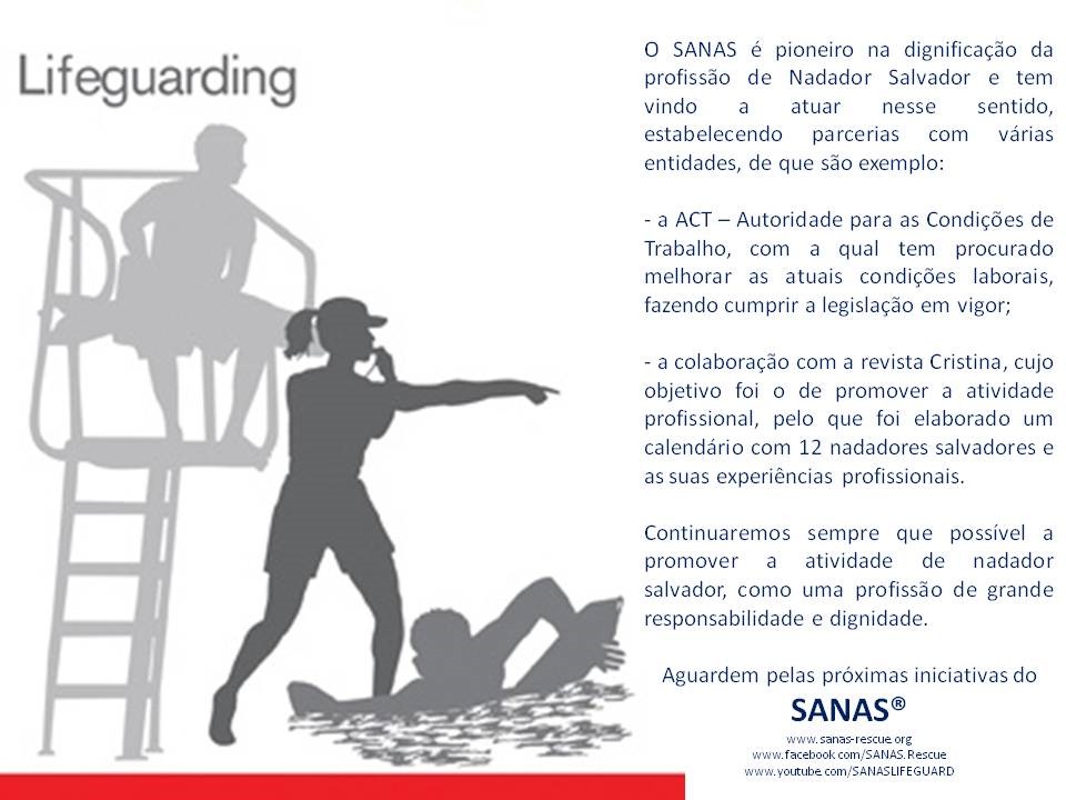 SANAS APOIA INICIATIVA PARA PROMOÇÃO DA PROFISSÃO DE NADADOR-SALVADORFoi com muito gosto que o SANAS colaborou na divulgação do desafio proposto pela revista “Cristina”, cujo objetivo foi o de promover a atividade profissional de Nadador Salvador, através da elaboração de um calendário com 12 nadadores salvadores | |