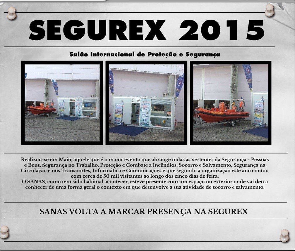 SANAS VOLTA A MARCAR PRESENÇA NA SEGUREXRealizou-se em Maio, aquele que é o maior evento que abrange todas as vertentes da Segurança - Pessoas e Bens, Segurança no Trabalho, Proteção e Combate a Incêndios, Socorro e Salvamento, Segurança na Circulação e nos Transportes, Informática e Comunicações e que segundo a organização este ano contou com cerca de 50 mil visitantes ao longo dos cinco dias de feira. O SANAS, como tem sido habitual acontecer, esteve presente com um espaço no exterior onde vai deu a conhecer de uma forma geral o contexto em que desenvolve a sua atividade de socorro e salvamento. |
